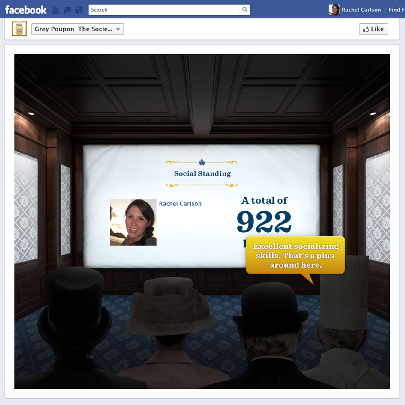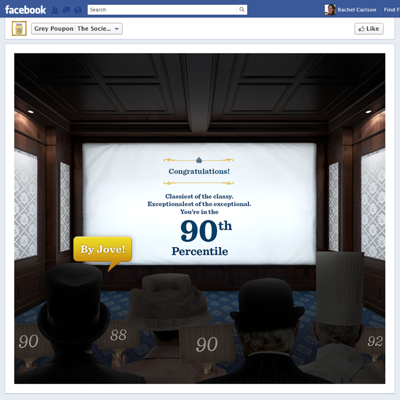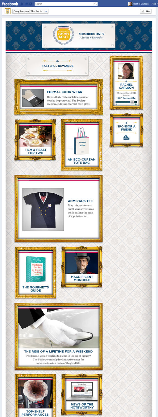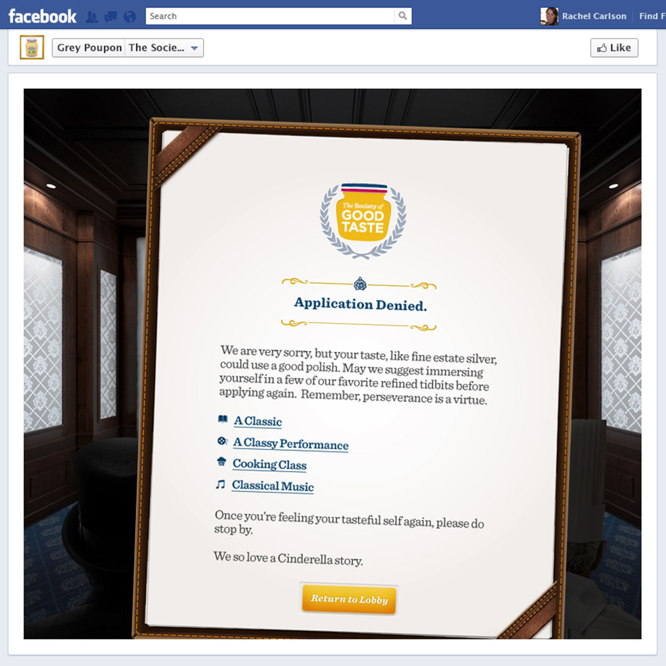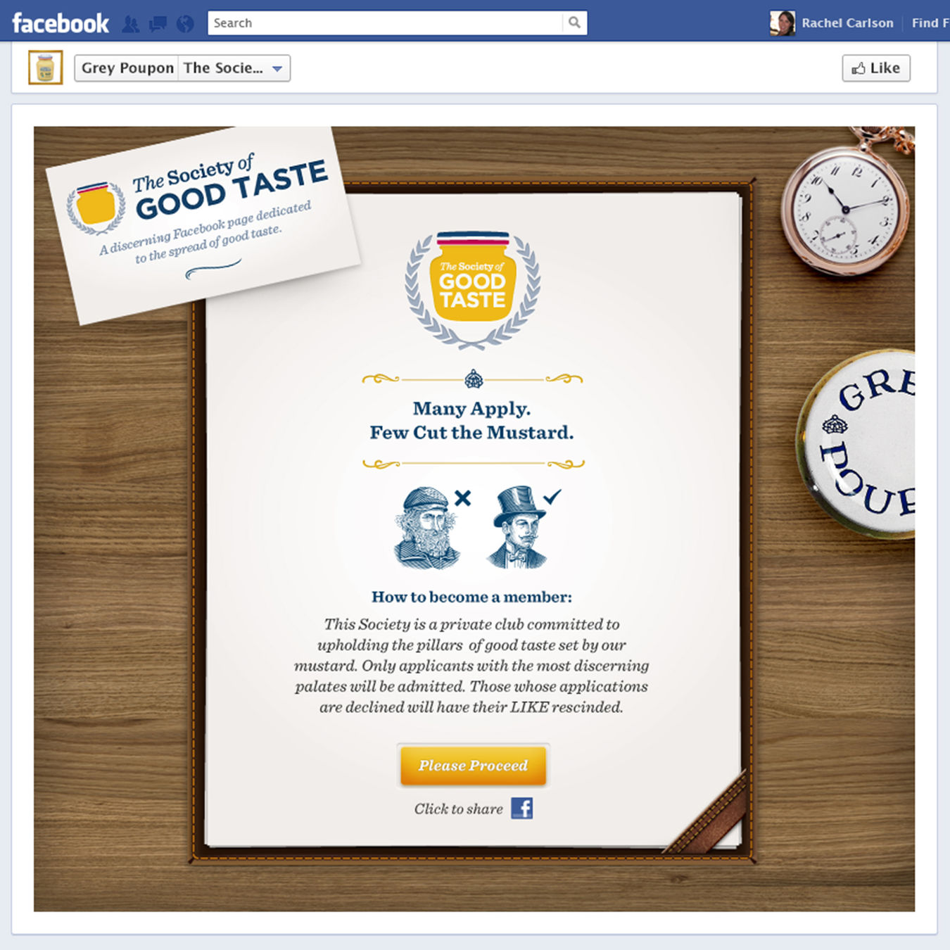 To launch Grey Poupon's social presence, we created an exclusive society on Facebook: The Society of Good Taste, that granted membership to only a select few based on the "tastefulness" of their social activity.