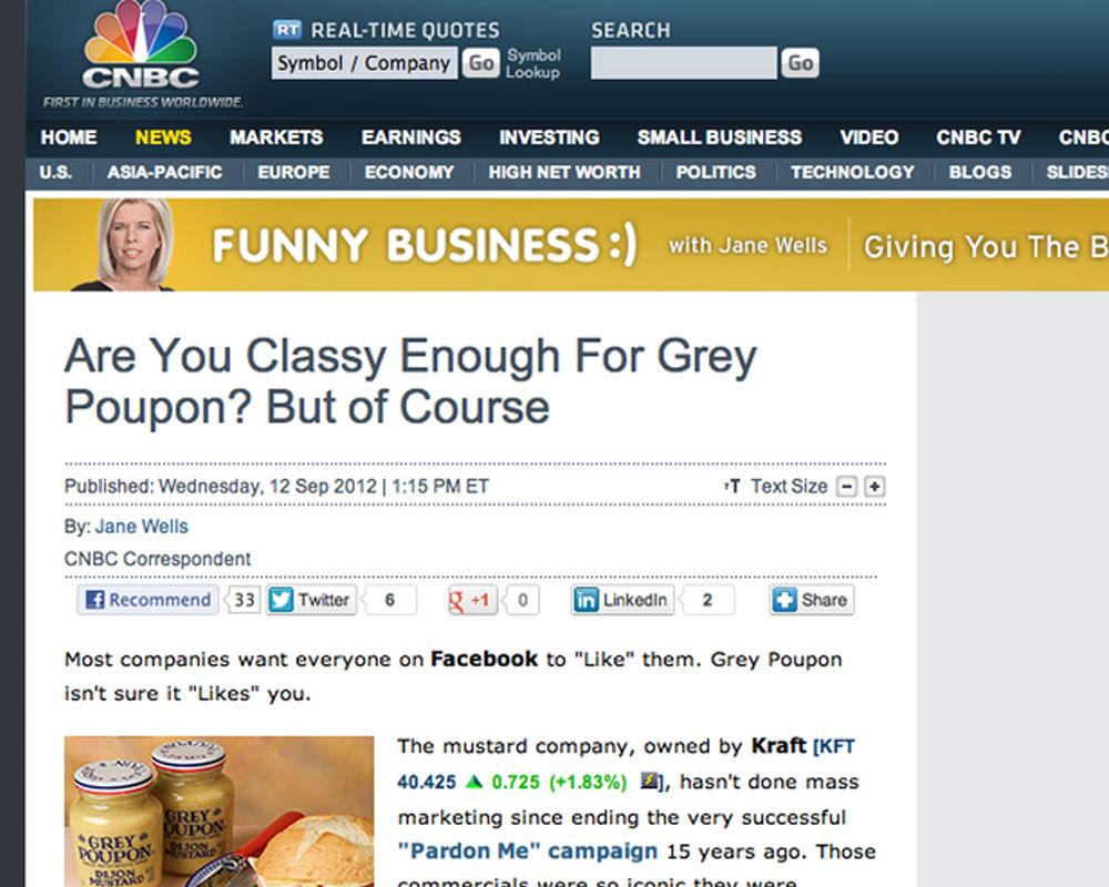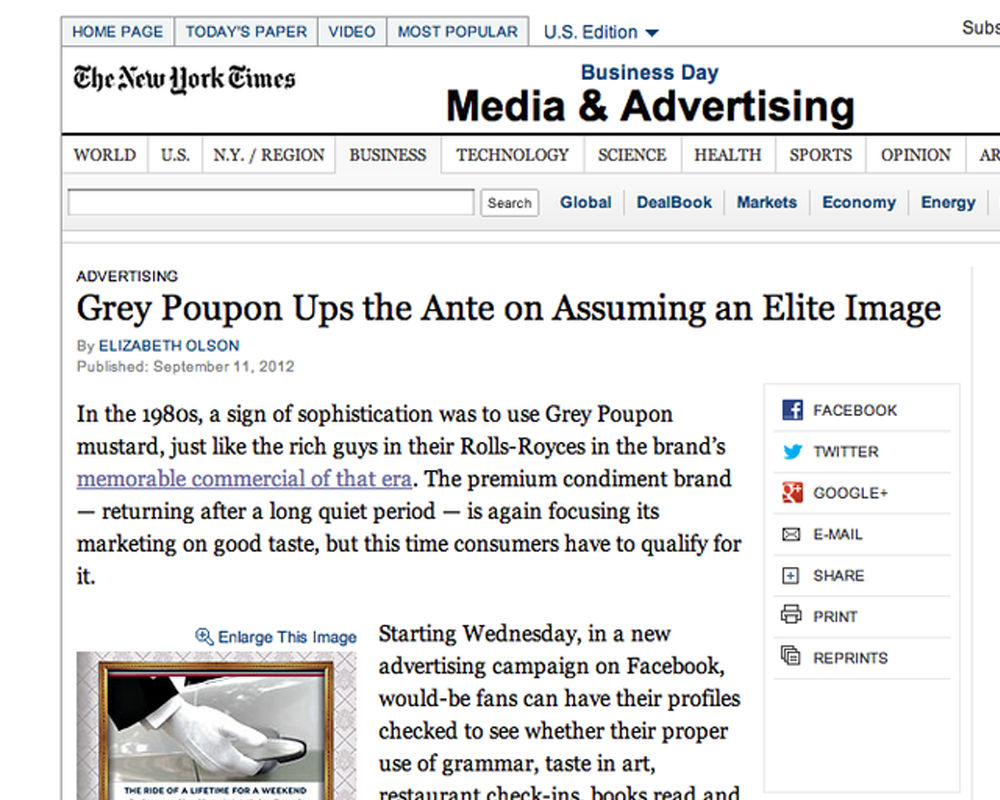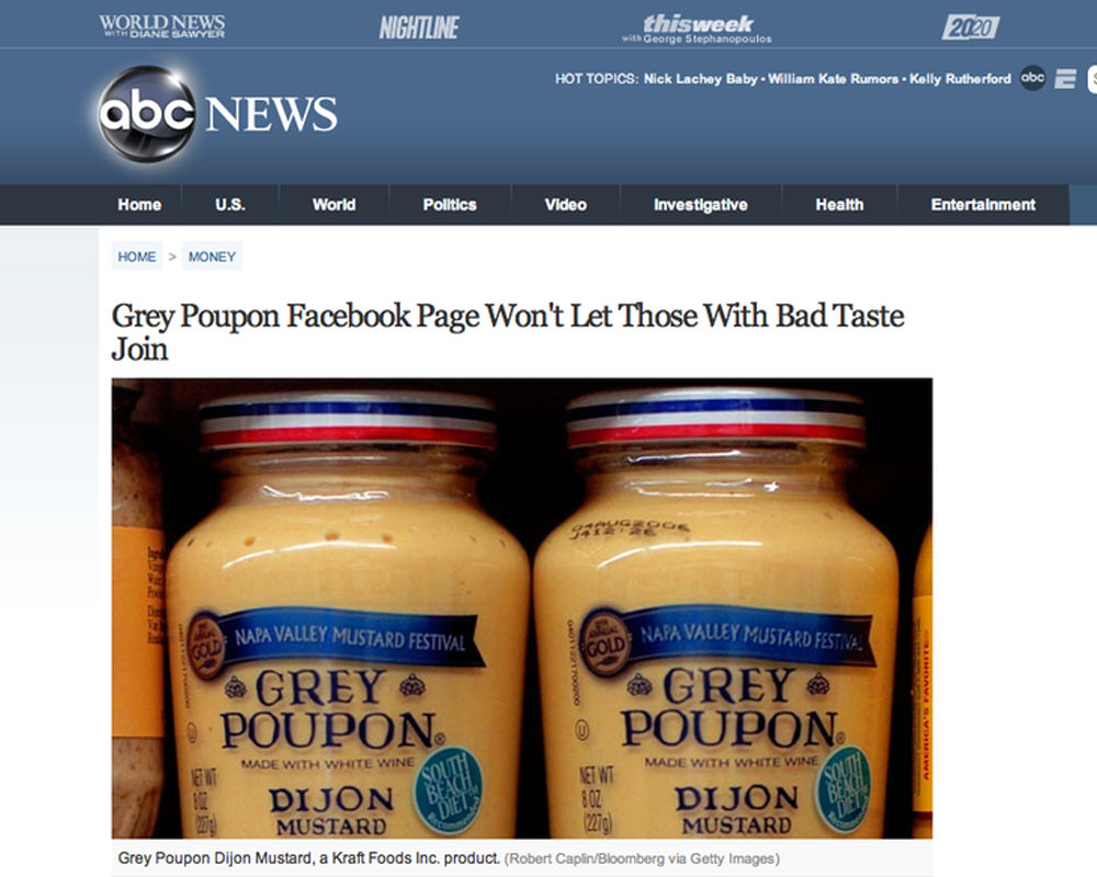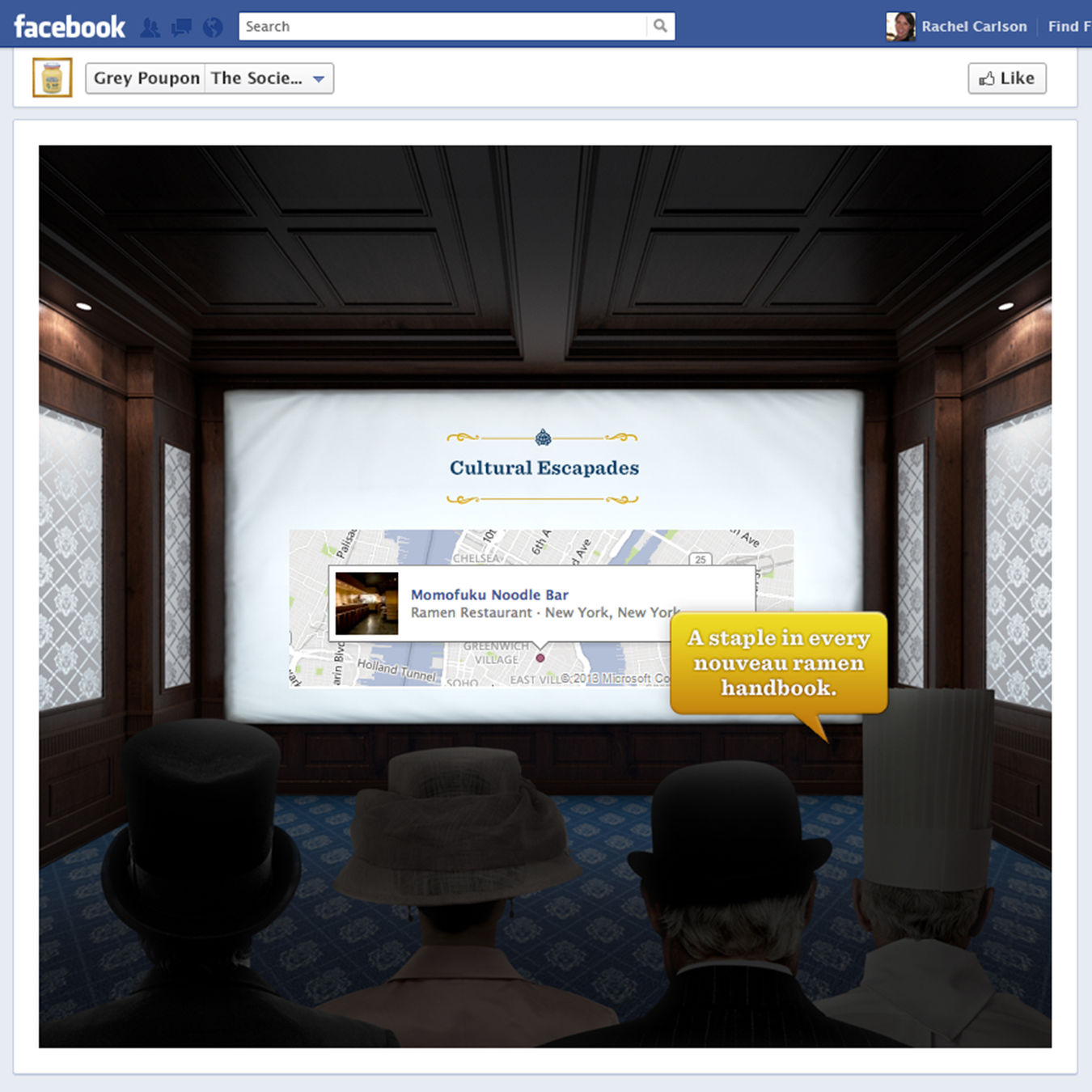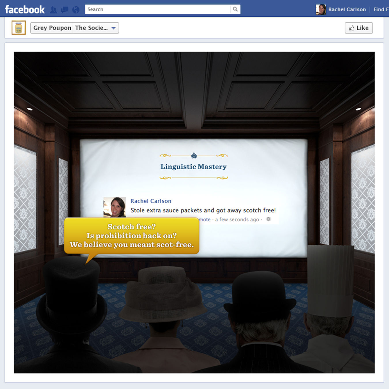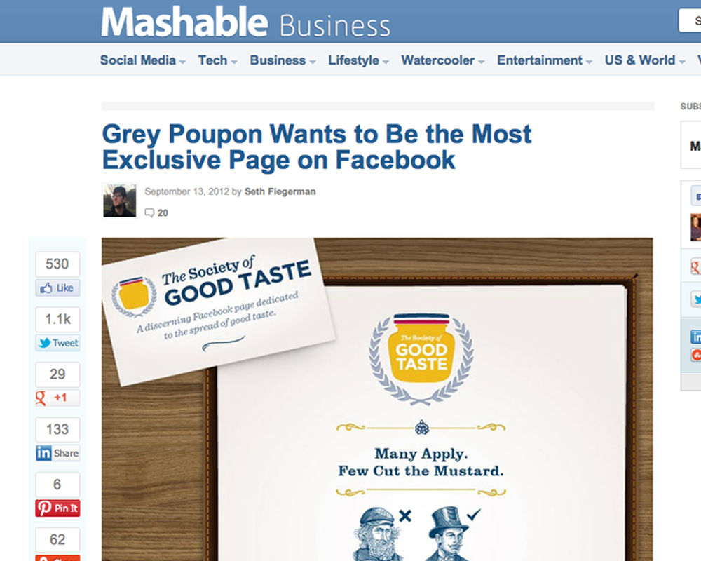 To launch Grey Poupon's social presence, we created an exclusive society on Facebook: The Society of Good Taste, that granted membership to only a select few based on the "tastefulness" of their social activity.